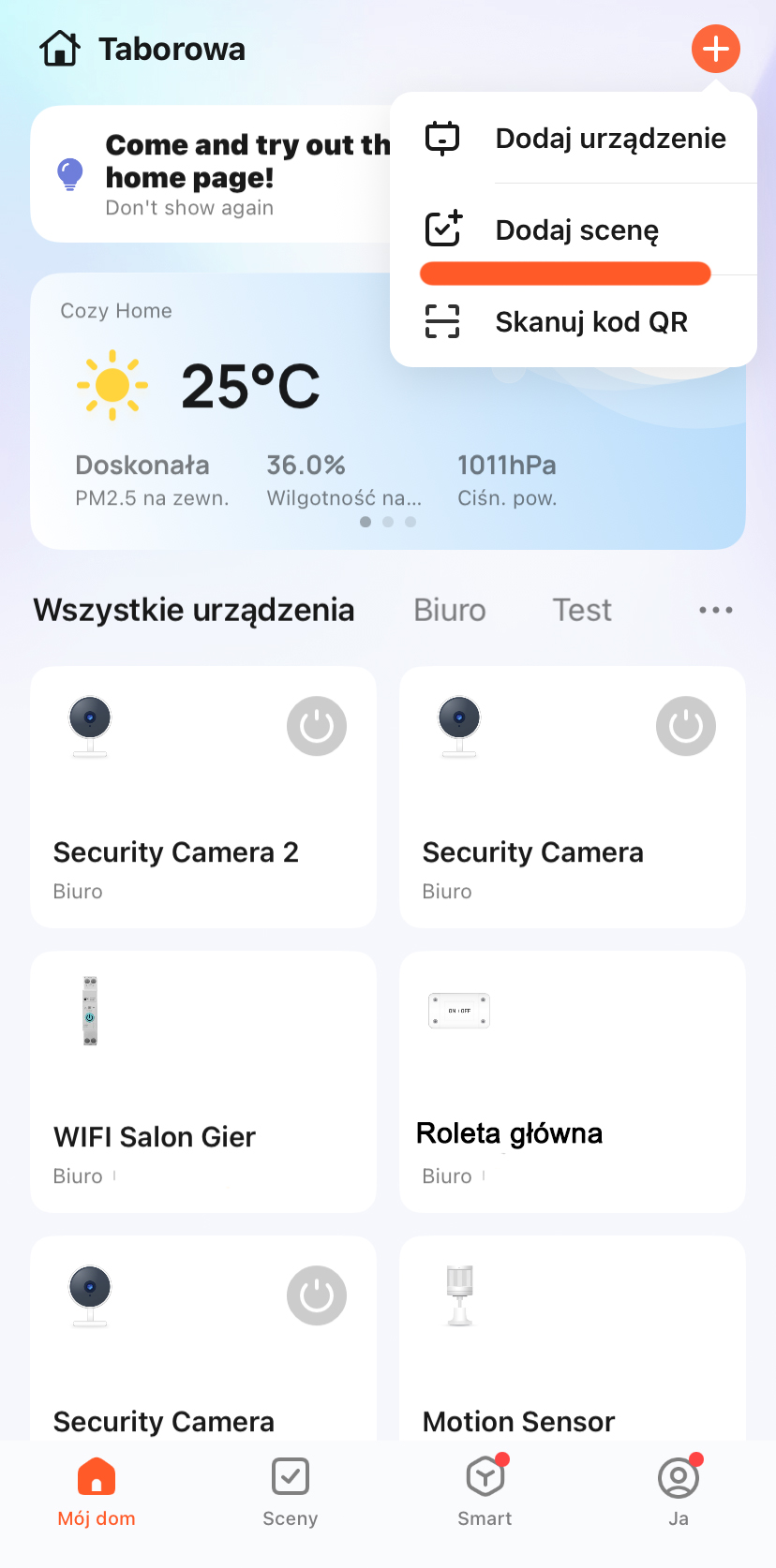 - Sceny i automatyzacje – np. „wyjście z domu” zamykanie rolety.