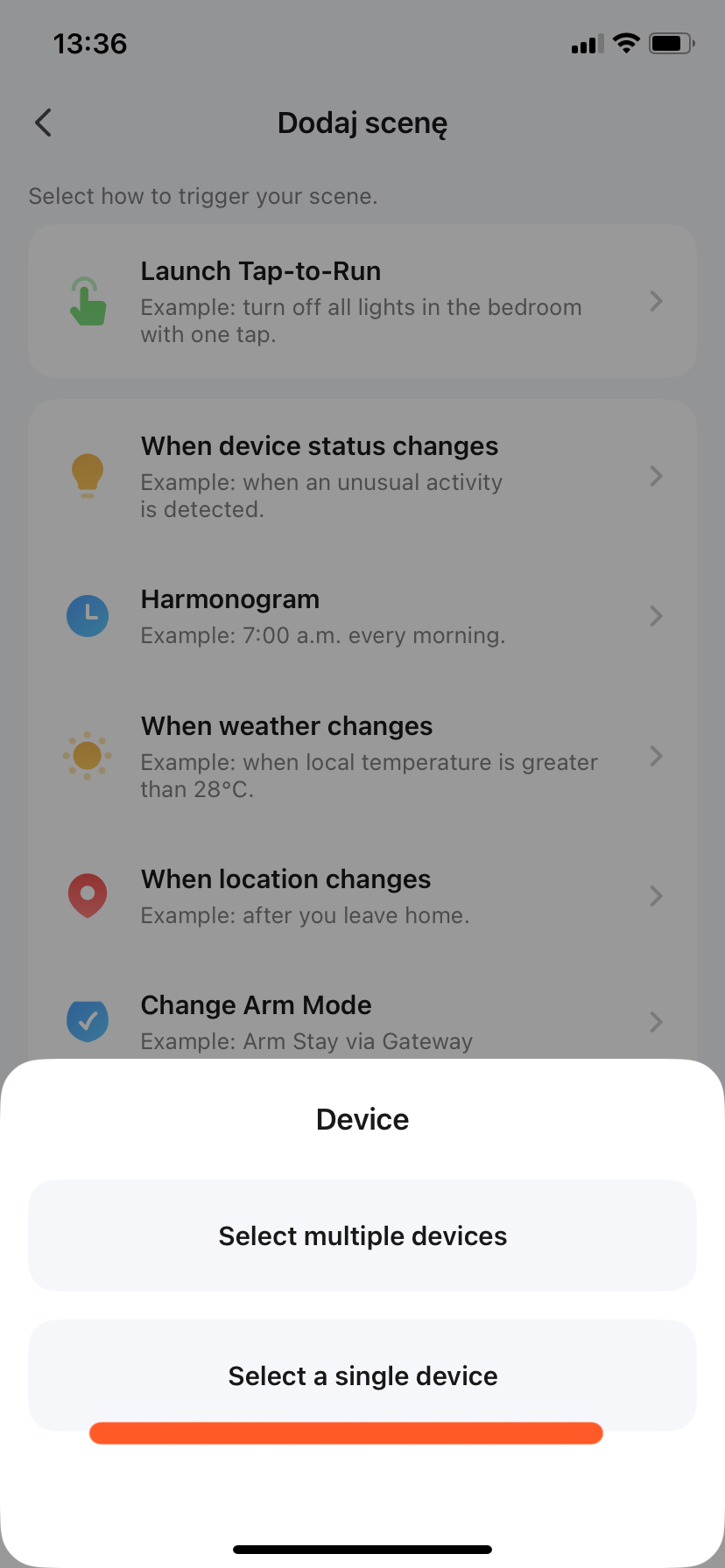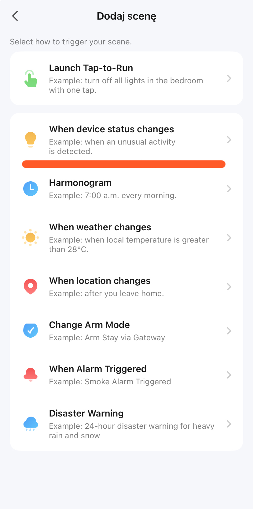 Następnie przechodzimy do funkcji – When device status changes ( gdy zmienia się status urządzenia),