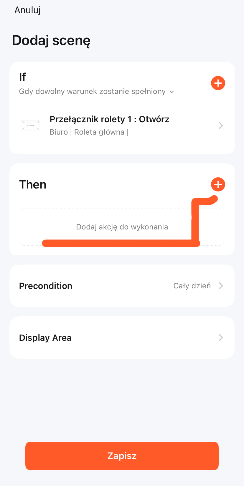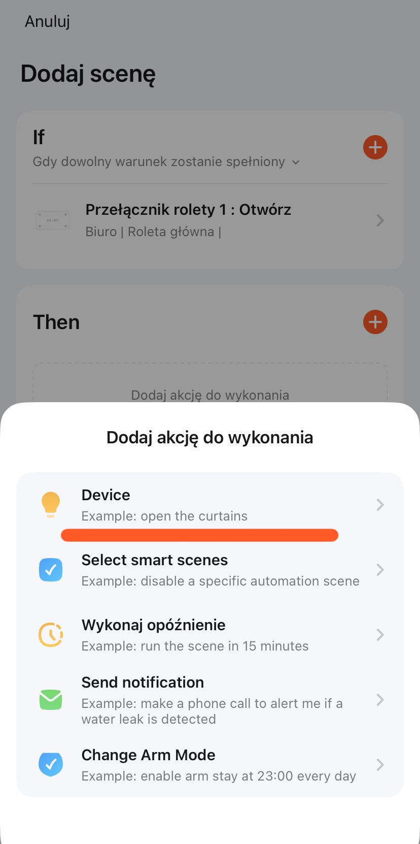 W dalszej kolejności dodajemy akcję do wykonania, czyli przypisujemy kolejne sterowniki rolet, by wykonały tą samą czynność co centralny sterownik,