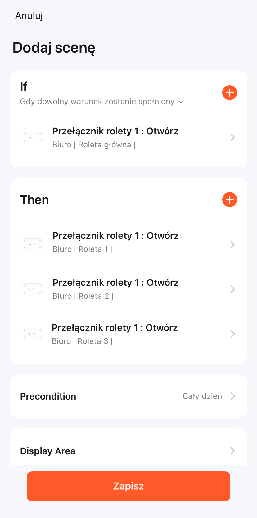 Po dodaniu wszystkich rolet i zapisaniu możemy nazwać naszą scenę w dowolny sposób np. Rolety - otwarcie.