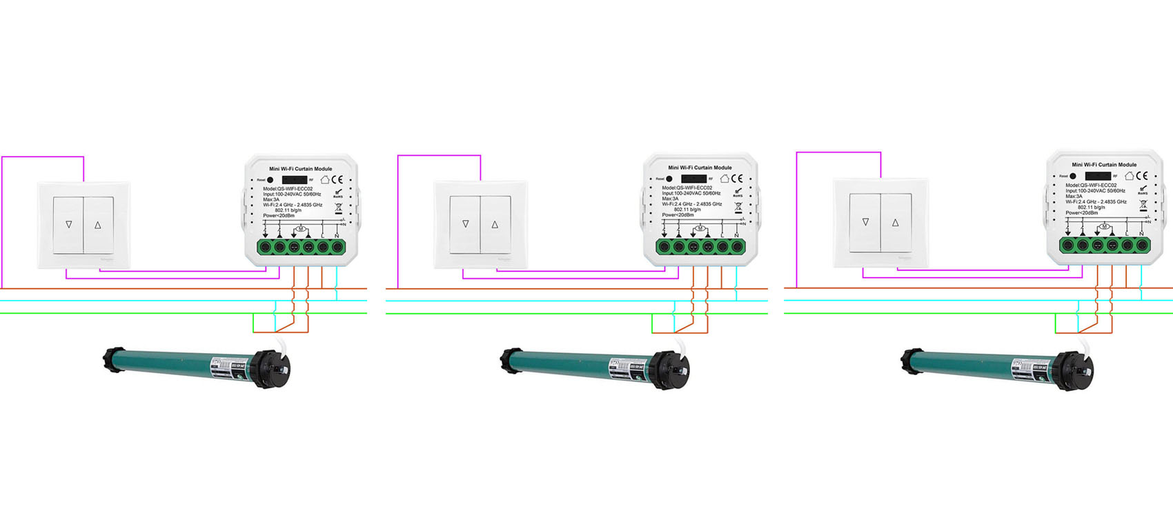 - W każdej rolecie montujesz sterownik Tuya - podłączony bezpośrednio do napędu rolety (L, N, przewody do góra/dół)/ Zasilanie: 230V.