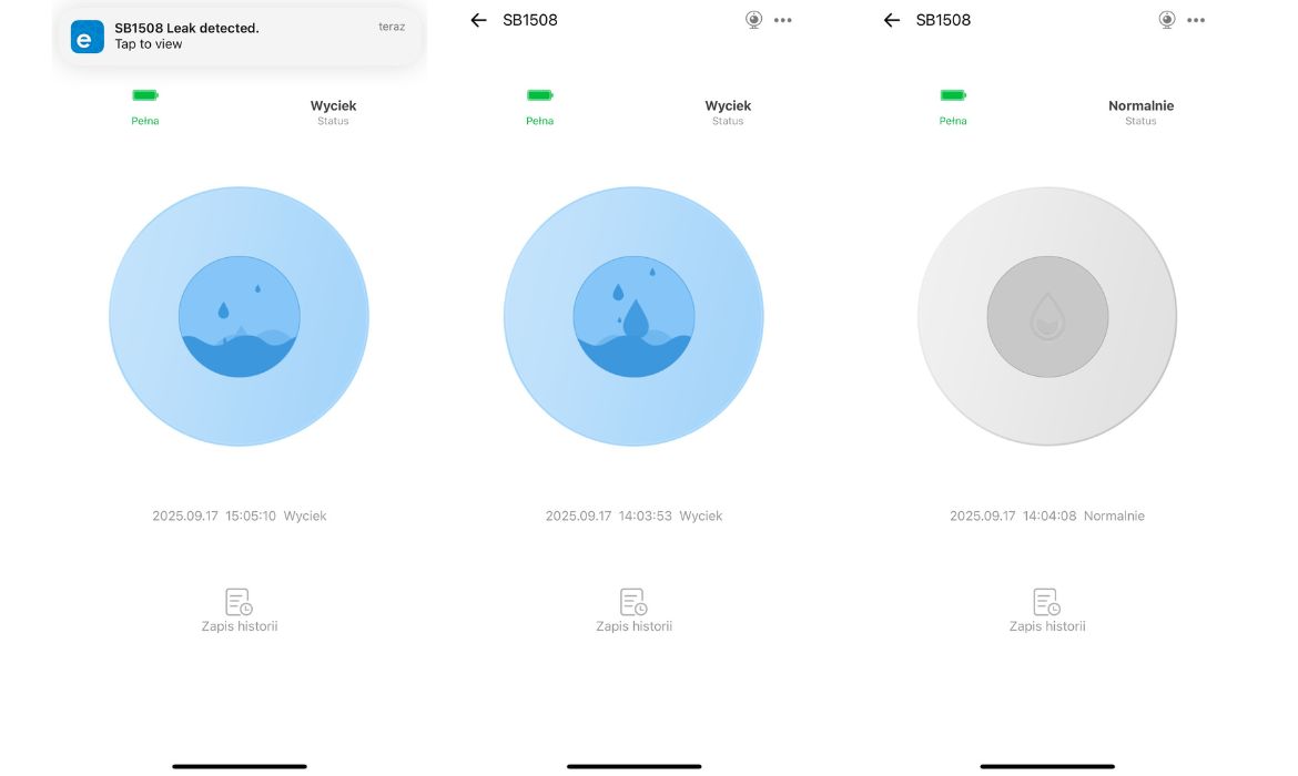 - aktualny status czujnika – czy wykryto zalanie czy brak zagrożenia,