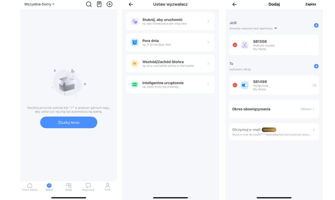 Możesz także tworzyć inteligentne sceny, np. automatyczne zamknięcie zaworu wody lub uruchomienie syreny alarmowej, gdy czujnik wykryje wyciek. Wszystko odbywa się w czasie rzeczywistym – niezależnie od tego, gdzie się znajdujesz.