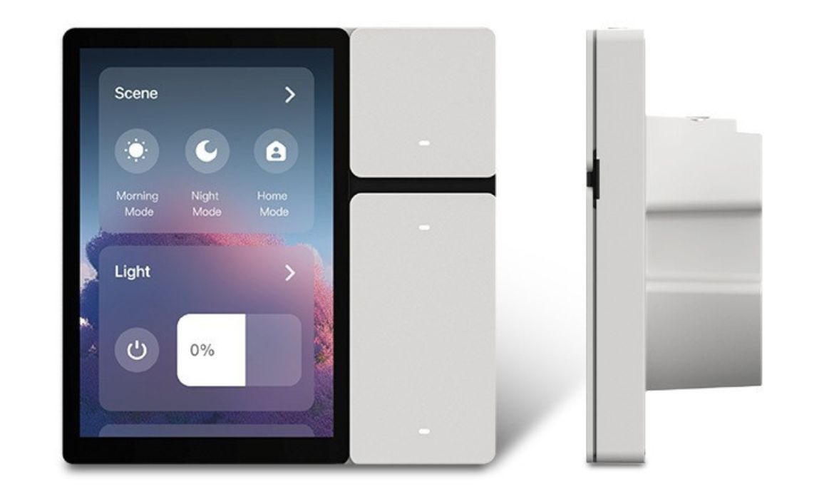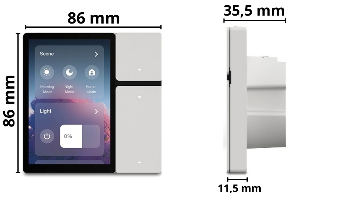 Urządzenie montuje się w klasycznej puszce podtynkowej 60 mm, a jego design w formacie 86×86 mm pasuje do standardowych ramek ściennych. Panel ma dotykowy ekran w języku polskim oraz trzy fizyczne przyciski, które możesz podłączyć do obwodów oświetlenia (do 200 W każdy) albo wykorzystać je jako przyciski funkcyjne – np. szybki podgląd kamery, uruchamianie scen, sterowanie gniazdkiem lub włączanie dowolnego urządzenia smart.