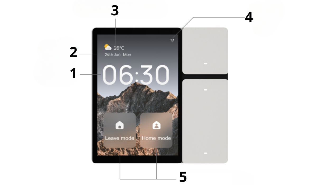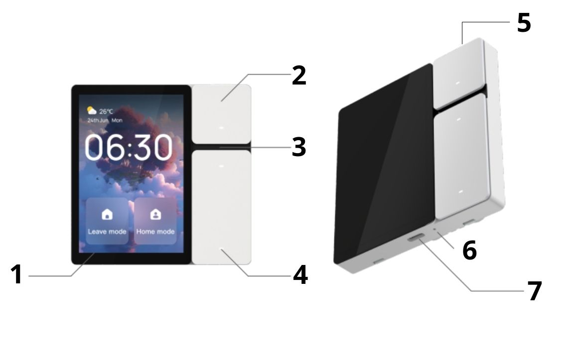 - Przycisk funkcyjny – możliwość przypisania akcji w aplikacji Tuya, takich jak szybkie włączanie gniazdka, uruchomienie sceny, podgląd kamery czy wywołanie skrótu systemowego (np. zmiana jasności ekranu, wybudzenie panelu).
