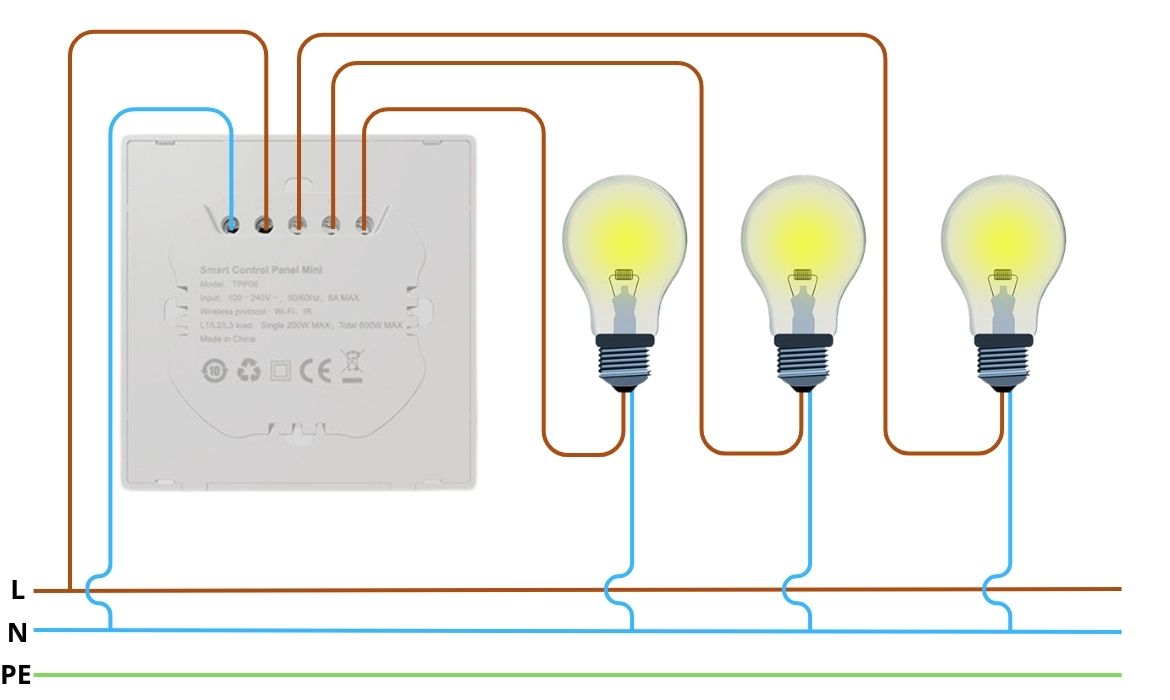 Panel Sone Smart One podłącza się tak jak klasyczny włącznik ścienny. Do działania wymagane jest doprowadzenie przewodu fazowego (L) i neutralnego (N). Trzy wyjścia przekaźnikowe (L1, L2, L3) można opcjonalnie wykorzystać do sterowania oświetleniem lub innymi obwodami – każde do 200 W (łącznie 600 W).