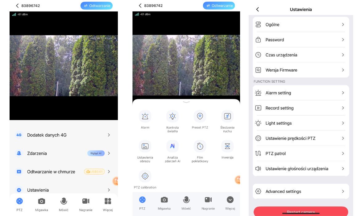 Dzięki łączności LTE możesz oglądać obraz na żywo, sterować obrotem PTZ, korzystać z inteligentnego śledzenia ruchu (Auto Tracking), ustawiać obszary alarmowe oraz odtwarzać nagrania zapisane na karcie microSD bezpośrednio w aplikacji.