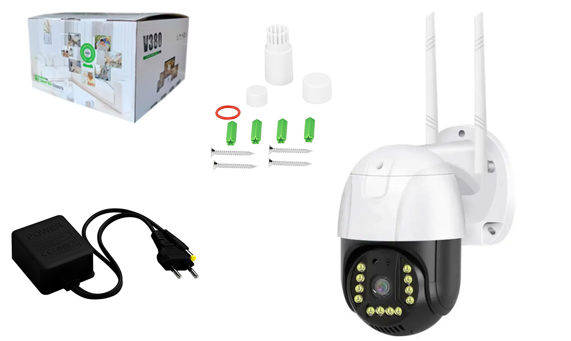 - Obrotowa kamera Sone zewnętrzna PTZ 3MP (Full HD), odporna na warunki atmosferyczne (IP66), z nagrywaniem w dzień i w nocy (IR + LED) oraz cyfrowym zoomem 4×. Urządzenie w pełni obsługiwane jest przez darmową aplikację V380 Pro (Android/iOS)