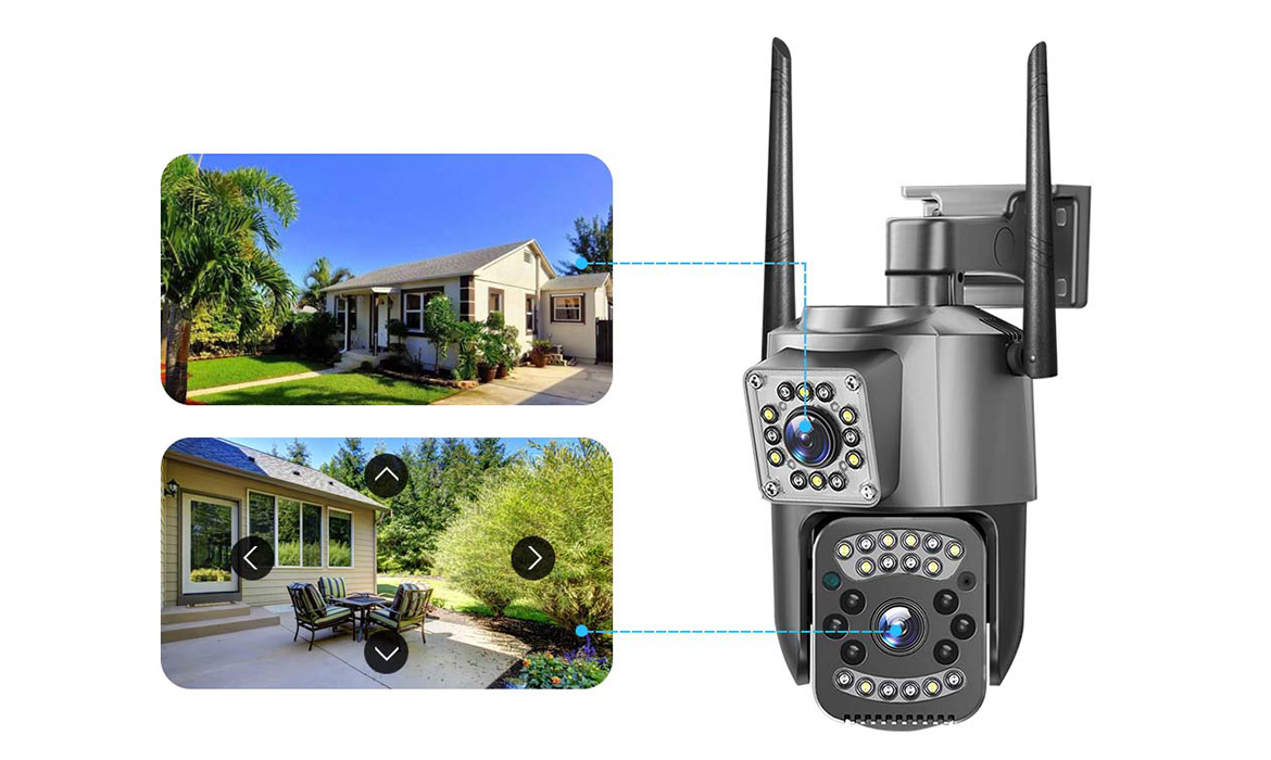 Kamera Sone 4G LTE posiada dwa niezależne obiektywy – górny obiektyw jest stały i zawsze skierowany na wprost, zapewniając szerokokątny podgląd otoczenia, natomiast funkcja PTZ dostępna jest wyłącznie w dolnym module obrotowym.