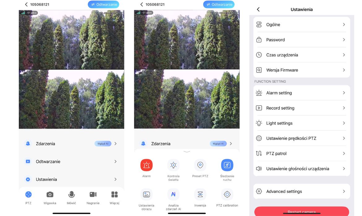 Dzięki połączeniu LTE możesz korzystać z podglądu obu obiektywów jednocześnie, sterować obrotem PTZ, włączać tryb patrolu, ustawiać obszary alarmowe i odtwarzać nagrania z karty microSD – wszystko z poziomu aplikacji w telefonie.