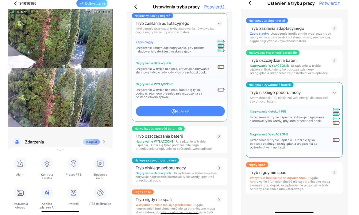 - Tryb niskiego poboru mocy – kamera aktywuje się po wykryciu ruchu przez czujnik PIR, a w przypadku niskiego poziomu baterii można ją wybudzić jedynie zdalnie z aplikacji.