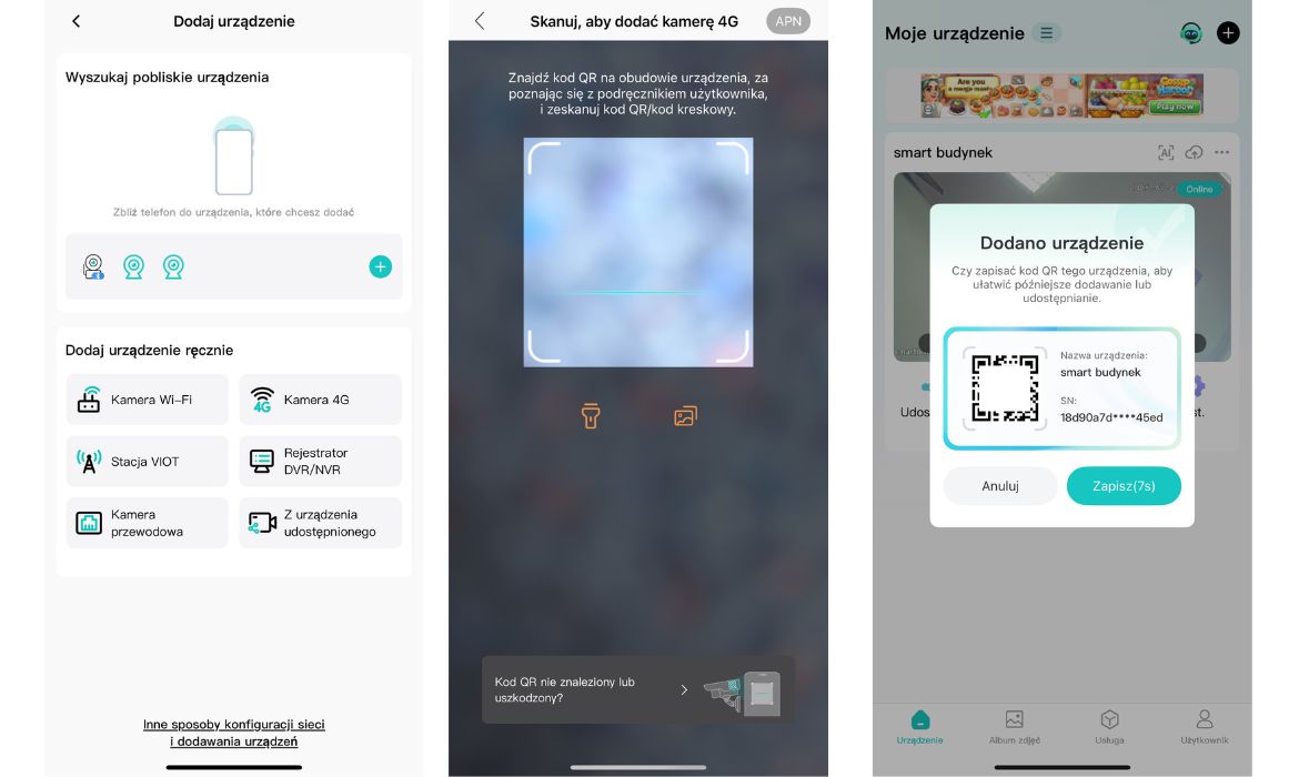 Po pomyślnym dodaniu kamery możesz zrobić zdjęcie kodu QR i zapisać je w galerii telefonu. Dzięki temu późniejsze ponowne dodanie kamery lub udostępnienie jej innej osobie będzie znacznie łatwiejsze.