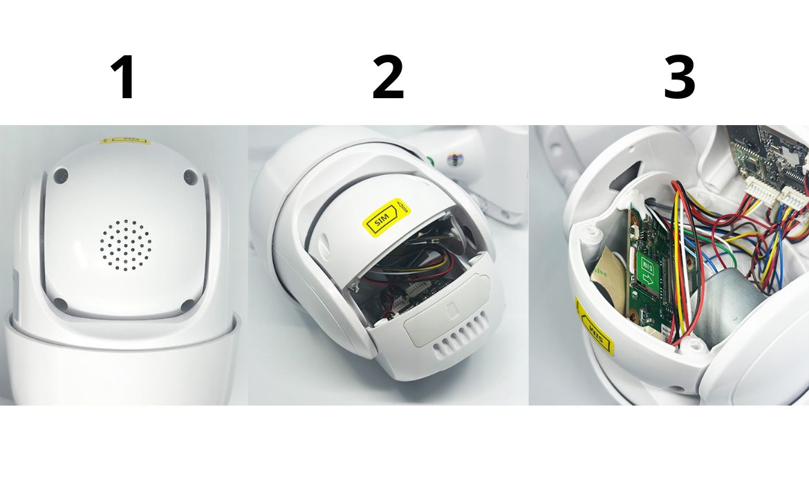 - Slot na kartę SIM znajduje się wewnątrz kopuły kamery – aby włożyć kartę SIM, należy rozkręcić obudowę i umieścić ją w specjalnym gnieździe w środku urządzenia