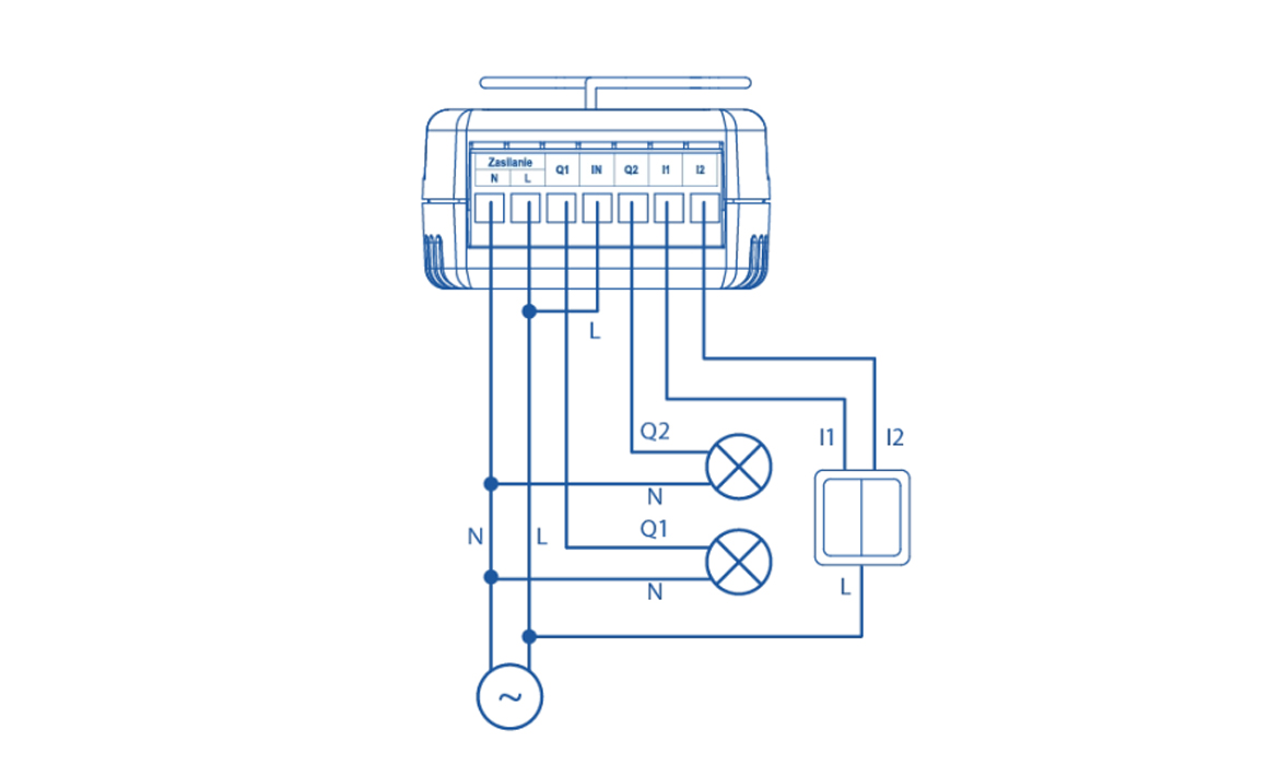 - Dwukanałowy przekaźnik do sterowania dwoma obwodami oświetlenia/zasilania