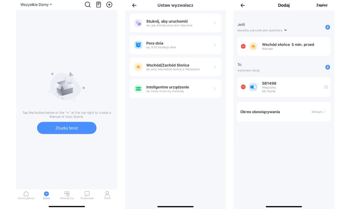 - Konfiguracja inteligentnych scen – automatyczne akcje uruchamiane na podstawie pory dnia, wschodu/zachodu słońca lub działania innych urządzeń