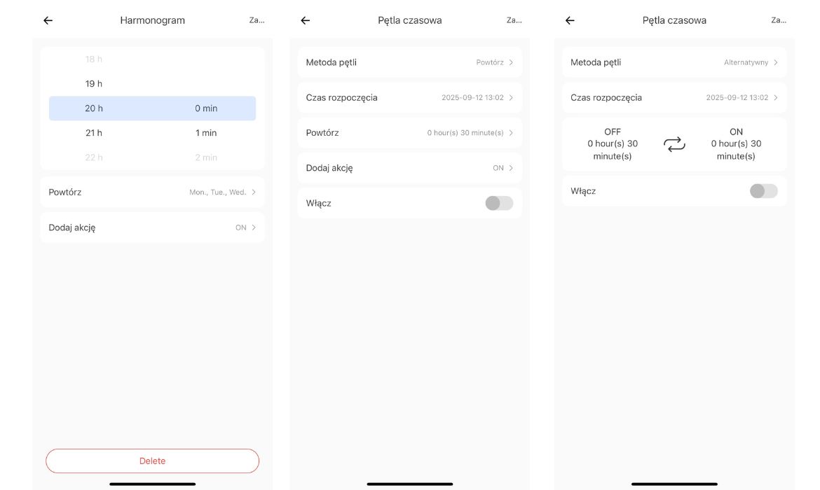 - Pętla czasowa – cykliczne włączanie i wyłączanie według zadanego interwału