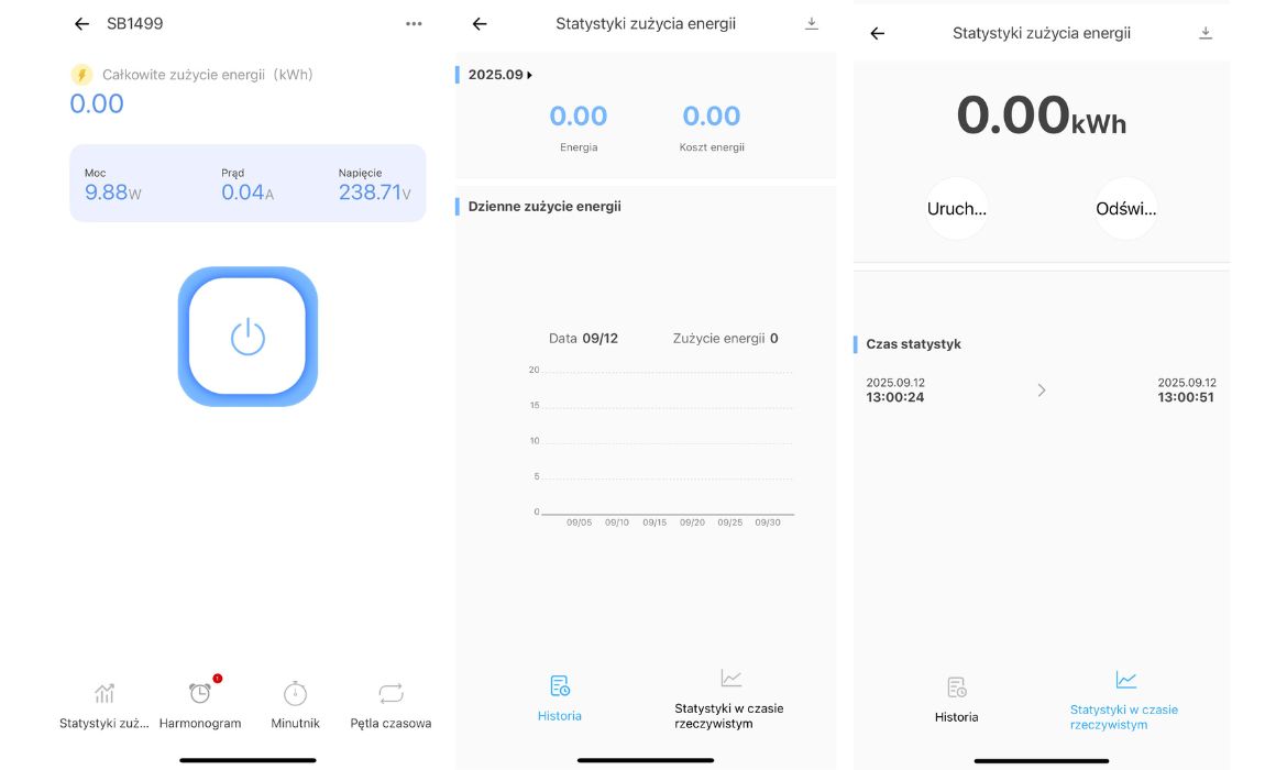 - Podgląd bieżącego zużycia energii (kWh), mocy (W), prądu (A) i napięcia (V)