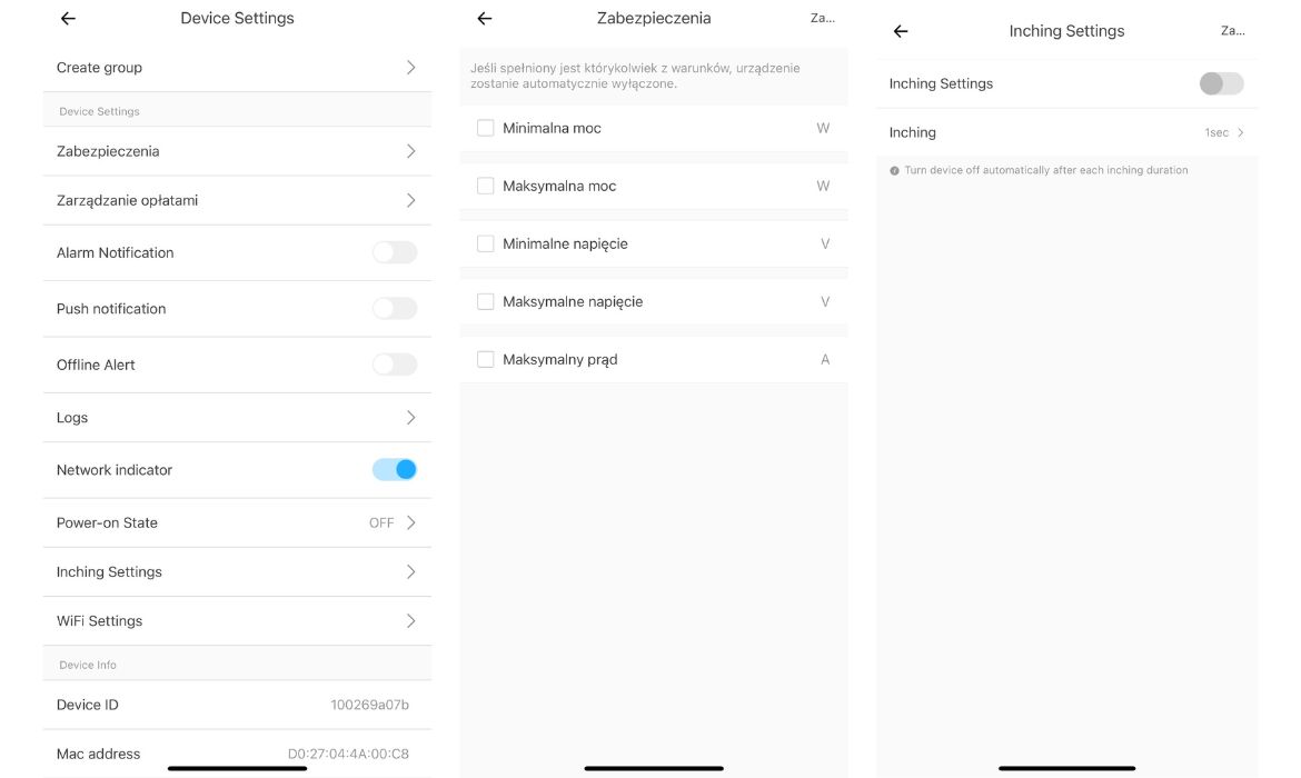 - Inching settings – automatyczne włączanie/wyłączanie w określonym czasie (od 0,5 sekundy do 59 minut).