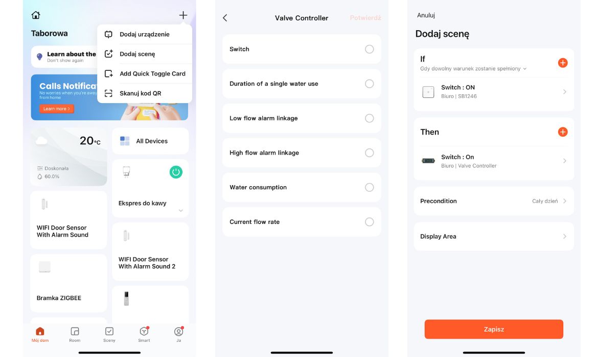 W odpowiedzi na inne zdarzenie (np. sygnał z czujnika zalania, harmonogram, pogoda), możesz ustawić zawór jako element wykonawczy: