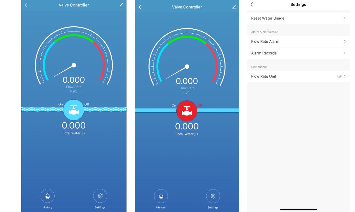 - Alarm przepływu (Flow Rate Alarm) – możliwość ustawienia progów, po których aplikacja wyśle powiadomienie push.
