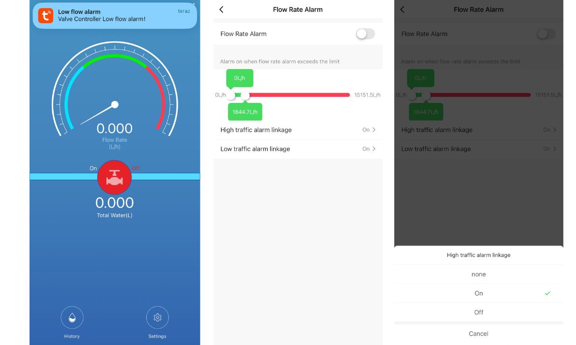 W aplikacji użytkownik może aktywować alarmy informujące o przekroczeniu ustawionych progów przepływu wody. Funkcja Flow Rate Alarm pozwala na: